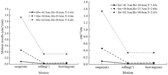 The motion of the jackup offshore platform under waves include rolling, surging, and heaving, as shown in Figure 11, where the rolling is perpendicular to pitching. The results of the movement test in the dynamic response simulation testing of the offshore platform structure under test waves show that when the height of a wave is small ( ≤ 18.6 cm), the platform does not produce significant motion under normal operating conditions. As shown in Figure 12, the platform produces significant motion under waves of large wave height: when the height of the input wave increases to 23.3 cm, the platform’s motion is mainly surging (along the propagation direction of the wave); as the height of the input wave increases to 30 cm, the platform not only produces significant longitudinal motion but also produces rolling and heaving. Thus, we can see that the amount of the platform’s motion depends critically on the height of the waves.
