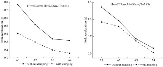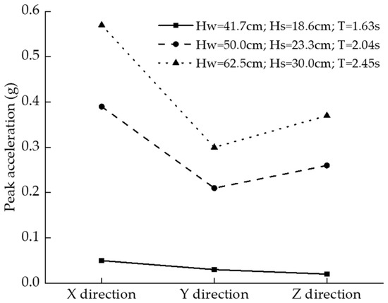 The results of the platform’s acceleration are essentially consistent with the results of the platform motion test. When the height of the input wave is small, the peak acceleration at the monitoring point generated by the platform under the conditional wave action is very small (i.e., effectively negligible), and the vibration direction is mainly in the longitudinal motion direction (i.e., the wave propagation direction). As the input wave changes to waves of large wave height, with the increase in the water’s depth and the height of the wave, the motion and the peak acceleration at the monitoring point on the top of the platform increase gradually. As shown in Figure 13, the maximum longitudinal acceleration is 0.57 g under waves ( = 62.5 cm; = 30.0 cm; T = 2.45 s). In addition to the longitudinal motion, the structural vibration direction also produces lateral vibration, and the maximum lateral acceleration is 0.3 g, which may be caused by the vortex-induced vibration in the lateral direction of the pile leg.