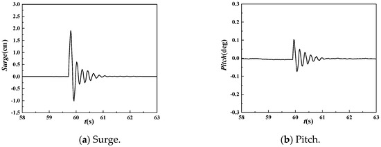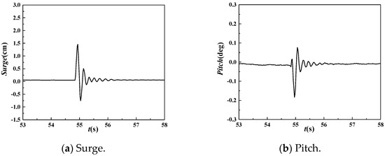 In the simulation test of the coupling action of the jackup offshore platform, tower, and seabed under wave impacts, the tower devices on the platform were divided into two types: undamped tower (model B) and damped tower (model C). The tower models are shown in Figure 2. Before the test of the jackup offshore platform models with towers under the impact of waves, their natural vibration period and equivalent damping were tested. Figure 14 and Figure 15 show the natural vibration curves of the tower structure without a damping device and with a damping device, respectively. The surge and pitch of the tower with the damping device are noticeably smaller than those of the tower without the damping device. Using spectral analysis, the natural vibration period and the equivalent damping of the two structures were derived, as shown in Table 5, which also shows that the damping device has significantly reduced the dynamic characteristics of the towers. The experiment results show that the damping device has an obvious influence on the dynamic characteristics and motion response characteristics of the tower. The natural vibration period of the tower with the damping device is smaller than that of the tower without the damping device, while the relationship between the equivalent damping values is the opposite.