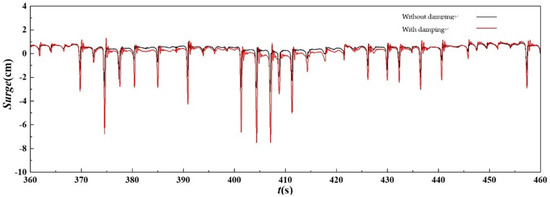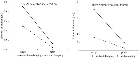 The experimental results show the differences between the tower without the damping device and the tower with the damping device under the same wave action. Taking the motion results of the towers under waves ( = 62.5 cm, = 30.0 cm, T = 2.45 s), for example, the comparison of the longitudinal motion history of the tower without the damping device and the tower with the damping device is shown in Figure 16. Under the same wave, the motion response of the tower with the damping device is significantly smaller than that without damping device. The longitudinal motion of the tower without the damping device is 3.13 times that of the tower with the damping device, and the pitch motion of the tower without the damping device is 3.34 times that of the tower with the damping device (see Figure 17).