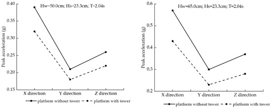 At the same time, we compared the acceleration at the monitoring points on the top face of the platform, as shown in Figure 19, where the X-direction is the wave propagation direction, the Y-direction is the rolling direction, and the Z-direction is the pitch direction. It can be seen that the acceleration of the platform itself with the tower is smaller than that without the tower, indicating that there is a coupling vibration effect between the tower and the platform, and that the installation of a tower can play a certain role in mitigating the vibration of the platform itself.