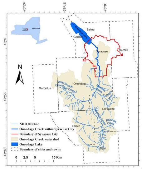 Geomorphologically, a majority of Syracuse serves as the downstream area of the Onondaga Creek watershed with an area of approximately 290 km2. The valley along the watershed was scoured by glaciers that created a terminal moraine at its headwaters in Tully. The mainstream of the watershed, Onondaga Creek, runs from the southwest in Tully along the valley to the north joined by the main tributary, the West branch on the west in the middle reach, then passes through the heart of Syracuse and finally drains into Onondaga Lake (Figure 1). Onondaga Creek has a total length of about 49 km, 14.5 km of which is within the City of Syracuse (Figure 1).