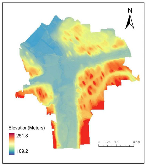 The DEM (Digital Elevation Model) of the study area generated from LIDAR (Light Detection and Ranging) data with the resolution of 0.3 m spatial resolution was obtained from the United States Geological Survey (USGS) open-source: https://apps.nationalmap.gov/downloader/#/ (accessed on 1 July 2020). The Landsat-8 images with 30 m spatial resolution were downloaded in the GeoTIFF format from the USGS Earth Explorer Website (http://earthexplorer.usgs.gov/, accessed on 1 July 2020). It was further used to extract the green land areas and calculate the NDVI for Syracuse. All of the images were free of clouds and sensor defects. The social and economic data about Syracuse City, including census, land use, and building footprints, were collected from Syracuse Onondaga County Planning Agency (SOCPA). The hydrological data, including annual peak discharges and the associated water stages of the Onondaga Creek, were obtained from the USGS gauging station located at Dorwin Avenue (numbered 04239000) (https://waterdata.usgs.gov/nwis, accessed on 1 July 2020). The software package used for processing the images and determining the values of the study was ENVI 5.1. The ArcGIS Pro was used to analyze the processed data and to visualize the results.