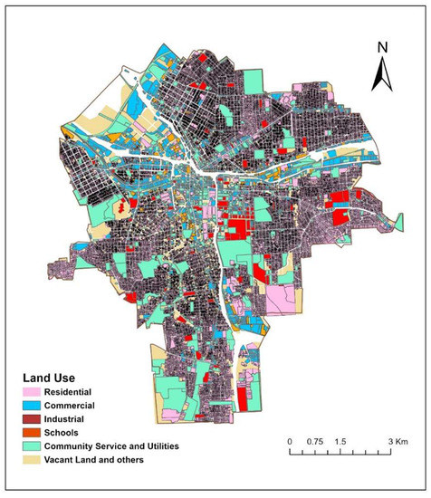 The topography of Syracuse features low, flat areas along with the downstream of Onondaga Creek and extends in two narrow belts towards the east and west, respectively (Figure 2). This area has an elevation ranging between 109 m and 140 m and is bounded by higher lands with variable hilly slopes. The low-elevation area constitutes the floodplain of the downstream reach of the Onondaga Creek and is the area directly susceptible to flooding. In the City of Syracuse, essential land uses include types of residential, commercial, industrial, schools, community service and utilities, etc. (Figure 3). The commercial areas are mainly in Downtown Syracuse, and a considerable number of residential and commercial buildings are distributed in the north and south of the city center, which are crossed by Onondaga Creek.