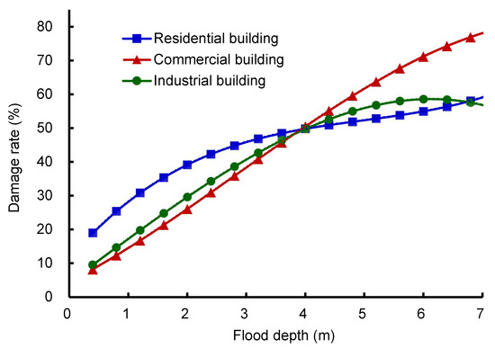 Based on the Equations (2)–(4), the depth-damage curves for different types of buildings were established in Figure 4. These curves are non-linear and intersect at one threshold, representing the 50% damage rate at an inundation depth of 4 m. Before this threshold, the damage rate of residential buildings is higher than that of the other two types of buildings for any inundation depth, but its rate of increase is less than that of the latter. After this threshold, the depth-damage functions of residential and industrial buildings tend to converge at the damage rate of 60% as the flood depth increases to about 6 m, while that of commercial buildings remains the highest among the three types of buildings.