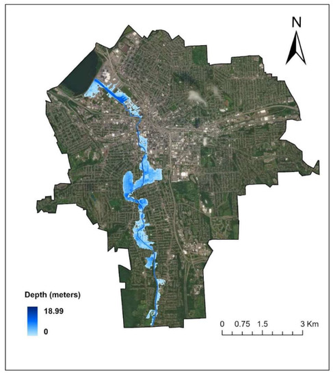 The inundation of the 500-year flood in Syracuse City was simulated using HEC-RAS and the GIS platform. Figure 5 shows the inundation extent; the darker the color corresponding to the deeper depth of inundation. The maximum water depth was 18 m. The Onondaga Creek passed through Syracuse City, causing severe flooding in the downtown area. Flooding might cause the inundation of land along both riversides of Onondaga Creek, which would lead to a total inundation area of 30.03 km2. The land close to the upper reach of Onondaga Creek, which was located on the south side of the city, was less inundated compared to that which was close to the downstream side. The majority of the inundation was caused by overflow in the middle section of Onondaga Creek, where more attention should be paid in further damage estimation analyses.