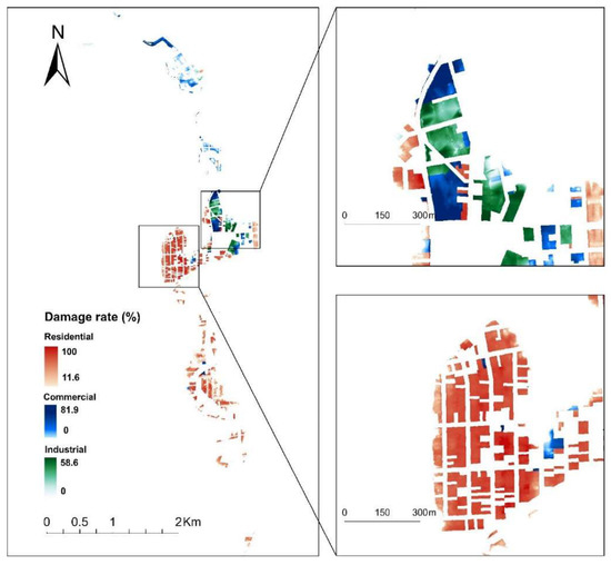 Based on the simulated 500-year flood, the influenced area and building footprint data of Syracuse were overlayed. The result was calculated using the three depth-damage equations (i.e., Equations (2)–(4)), which indicated that a total of 1139 buildings, occupying an area of 748,872 m2, would be flooded during this projected extreme event. Among these inundated buildings, 997, which covered an area of 465,256 m2, were residential buildings; 116, which covered an area of 178,990 m2, were commercial buildings; and 26, which covered 104,625 m2, were industrial buildings. The damage rate of residential buildings ranged from 11.6% to 100%. That of commercial buildings ranged from 0% to 81.9%. The industrial buildings had a lower damage rate compared to the other two, which ranged from 0% to 58.6%. A total of 326 buildings would be severely damaged by more than 80%, with the remaining 1000 buildings suffering various degrees of damage (Figure 6).