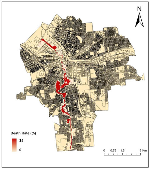 In Figure 7, the darker the red color was, the higher the death rate was. There was a high death rate in residential areas in the south of Syracuse. The city center had the highest death rate, which reached 0.34. These two areas corresponded to larger flooding areas and deeper water depths, which in conjunction with a higher population density, resulted in more severe population casualties. The number of victims in a flooded area mainly depended on the number of residents living there. Applying this death rate matrix to the population distribution map, the total number of victims could reach 900 people.