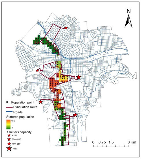 Figure 8 illustrates the spatial distribution of both the inundated population and the designated evacuation shelters in the study area. The total estimated population demand for the shelter of each grid area was classified by natural breaks and shown in different colors, from green to red. The areas with many suffered populations (yellow and red grids) were primarily located in the middle part of the study area, while the southern and northern parts of the city had fewer suffered populations (green grids).