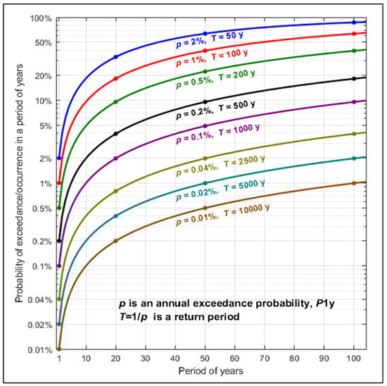 The return period is the inverse of the annual exceedance probability (AEP) of the event of a given magnitude and, unfortunately, is frequently confused with the period of years for which the exceedance probability of this event is considered [4,5,6,7,8]. The importance of the correct understanding of this statistic is explained in great detail in [4], mostly based on R. Vogel et al. [9,10]. The remarkable example of the true meaning of a 2% exceedance probability during a 50-year period is worth citing in this context as follows: “Earthquake engineers, for example, relate the strength of new buildings to ground shaking from the “maximum considered earthquake” in an area, which has a 2 percent chance of being exceeded in a 50-year period. That equates to 98 percent reliability that such an earthquake will not happen within the 50-year time frame (equivalent to protecting against an earthquake with a 2475-year average return period)” [4].