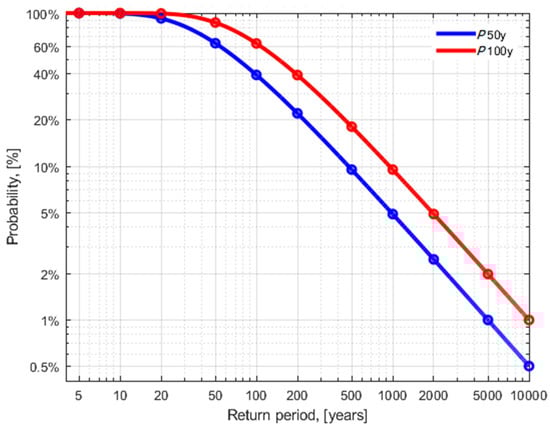 Figure 2 allows a reader to graphically derive which return period should correspond to the return level of any structure in order to ensure its required reliability [2], and vice versa, what reliability would correspond to a given return period. In part, Figure 2 allows a reader to easily identify the numbers presented in the example [2] (p. 78–1) as follows: given a 100-year extreme event, the reliability of the structure over its planned 50-year lifetime would only be 60.5% (which is much less than imaginable 99%), because, for T = 100 years, P50y = 39.5%.