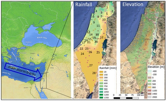 The study area: Israel. Left panel: its locations in the SE Mediterranean; central panel: its rainfall climatology (based on data for 1991–2020 provided by the Israel Meteorological Service) and numbers of subregions referred to in other figures; right panel: topography [16].