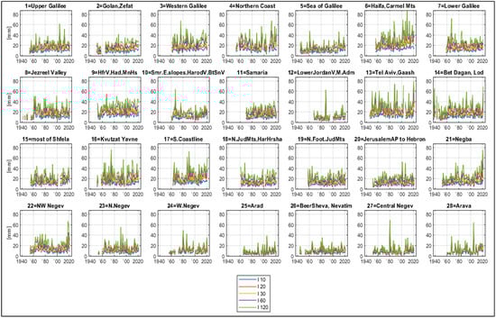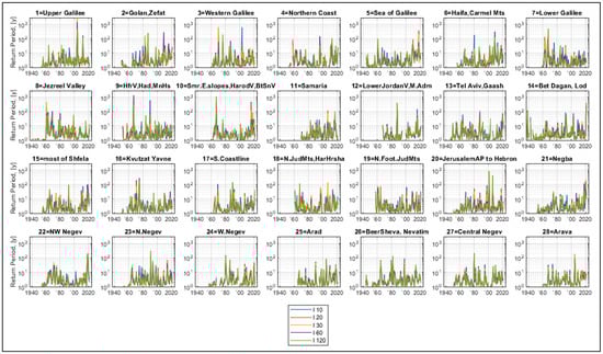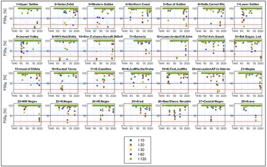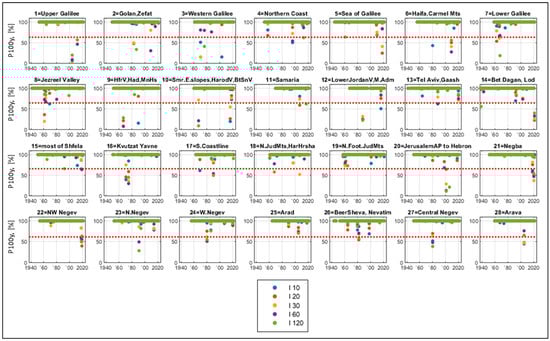 Figure 7 shows the exceedance probabilities of the short-interval rainfall intensities in Israel for a period of 100 years. In most cases, they get stuck close to 100%, which indicates annual maxima with a low return period. In some years, 100-year probabilities are visually very small, which means the years with the most intense annual rainstorms, correspond to the longest return periods. As mentioned above, a 100-year probability of less than 63% corresponds to return periods longer than 100 years, which is longer than the observational period. We see that in most regions, such rainstorms occurred more than once. Moreover, in regions 1–3, 6, 7, 9–12,14, 16–18, and 20–22, they occurred twice and more, being separated by sometimes only a few years, while in region 22 they occurred two years in a row.