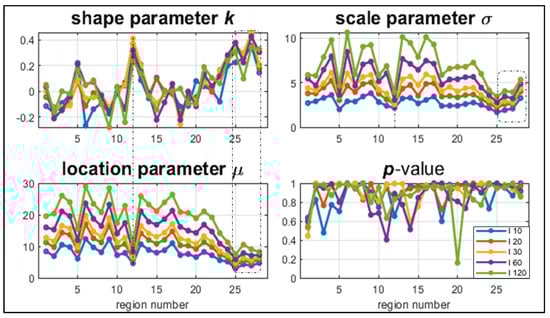 Figure 5 shows GEV parameters estimated with the maximum likelihood estimation (MLE) method (assuming the independent identically distributed (i.i.d.) annual maxima) and p-values. The p-values, evaluated with the Anderson–Darling goodness-of-fit test, show that all GEV distributions were fit well to the RI data.