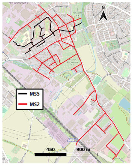 In order to test the approach, the tool is applied for the generation and design of two subnetworks of the Dresden drainage system. One of these is a combined sewer system, referred to here as MS2 and the other is a separate sewer system, labeled here as MS5 (see Figure 1). These areas are selected due to the fact that real sewer system data are available, i.e., information regarding the real sewer layout, pipe hydraulic characteristics, and measured flows are available. Results from the proposed approach can then be compared with the data of the real UDNs in order to assess their validity. Specifically, the performance of the tool is evaluated based on its capacity to: (1) generate a sewer network with a similar layout as the existing system; (2) design a network with a similar pipe diameter distribution, i.e., similar hydraulic properties; and (3) properly represent stormwater and wastewater flow dynamics and volumes.