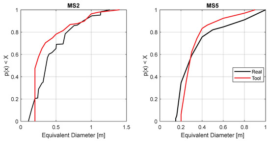 Results obtained suggest that the proposed tool is also able to generate systems with hydraulic properties similar to the real ones. This can be seen by comparing the empirical cumulative distribution functions (ECDFs) of pipe diameters for the generated and the real sewer networks. Since several pipes of the real sewer systems include egg-shaped cross-sections, equivalent diameters are calculated to facilitate comparisons between the generated and real systems. The similarity of these two systems in each case study is evaluated based on a two-sample Kolmogorov–Smirnov test [30] with a 95% significance (α = 0.05.) As can be seen in Figure 3, results indicate that the ECDFs of pipe diameters for the generated and the real sewer networks are statistically similar and hence have similar hydraulic properties. This is represented by the low p-values obtained in each case, 2.70 × 10−16 for MS2 and 4.5 × 10−3 for MS5.