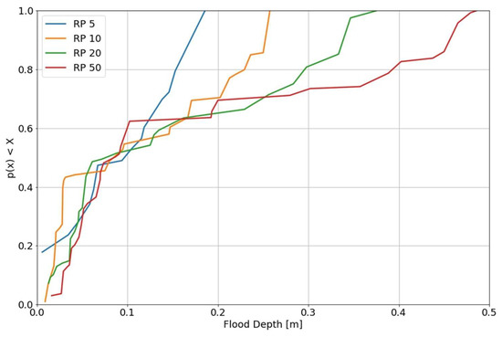 Based on the generated flood maps, further analyses can be performed. On the one hand, for a given rain event, the total flooded areas in the analyzed region can be quantified. This can be easily determined based on the number of pixels in the generated flood map and on the area of each pixel. For example, results suggest that the total flooded area caused by the 5-year return period rain event is 1976 m2, while for a 50-year event, it increases up to 4136 m2. On the other hand, the information regarding the flooded areas and their corresponding water heights can be used to analyze how flood depths vary according to the intensity of the precipitation event. An example of this can be seen in Figure 6, which illustrates the cumulative distributions of flood depths for each rainfall scenario (RPs 5, 10, 20, and 50). As expected, maximum flood depths increase consistently when increasing the event intensity, i.e., for higher return periods. Furthermore, results suggest that for all scenarios, between 50% and 60% of the flooded areas have an associated water depth equal to or lower than 0.1 m. These outcomes suggest that regardless of the rain event, it is expected that at least half of the flooded areas would have a depth of a maximum of 0.1 m. These results could serve as a basis for the implementation of management strategies or derive initial estimations related to flood damages.