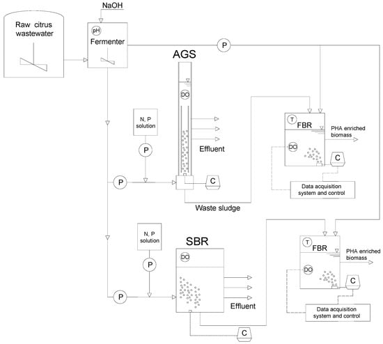 Pilot plant layout. Legend: C: air blower; P: pump; pH: pH controller; DO, dissolved oxygen sensor; T: temperature sensor.