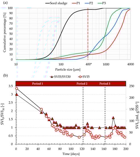 Particle size distribution of aerobic granular sludge during the experiment (a); trends of SVI5/SVI30 ratio and SVI5 (b). 400 µm represents the cut-off value between flocculent and granular sludge assumed in this study.