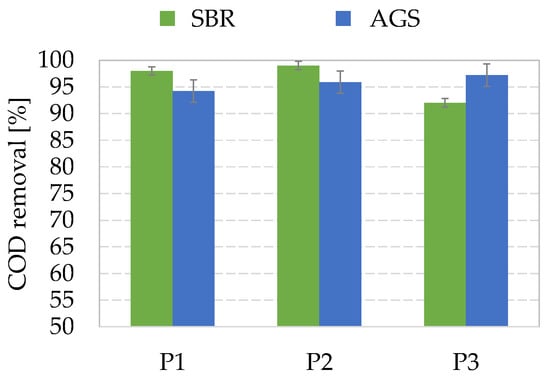 Both the enrichment AGS and SBR exhibited very high carbon removal, higher than 90% in general. In more detail, SBR showed a slightly decreasing trend with the OLR, although the effluent COD concentration resulted always lower than 400 mgO2 L−1, in compliance with EU regulations for industrial wastewater []. In contrast, AGS showed greater reliability in COD removal at increasing OLR. Indeed, even in Period 3, the average COD removal was higher than 95%, thereby resulting in effluent COD concentration lower than 200 mgO2 L−1.