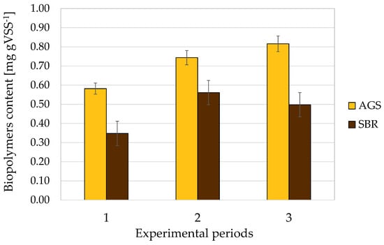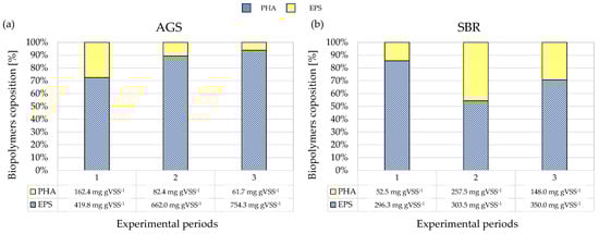 In Period 1, the biopolymers extracted from the AGS were mainly constituted by EPSs, accounting for approximately 70% (419.8 mg gVSS−1), whereas the PHA content was almost 30% (162.4 mg gVSS−1). A similar result was observed in the SBR. Indeed, EPSs were the main extracted biopolymer (83%, 296.3 mg gVSS−1), and the PHA content was lower (17%, 52.5 mg gVSS−1).