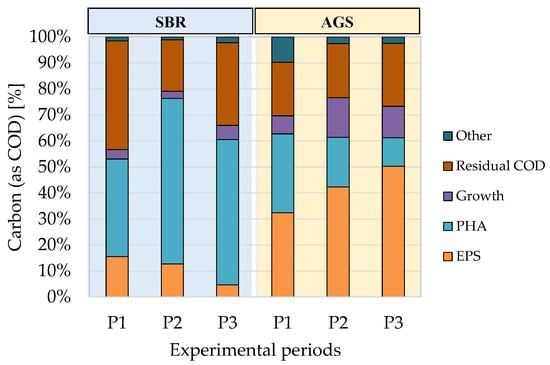To examine how the organic matter was used by the enriched MMC of the AGS and SBR in the FBRs, mass balances were assessed to evaluate the conversion of the COD into intracellular biopolymers (PHA), extracellular biopolymers (EPS) and new biomass. All these elements were expressed in terms of COD using the respective conversion coefficients reported in Section 2.5. The achieved results are shown in Figure 6.