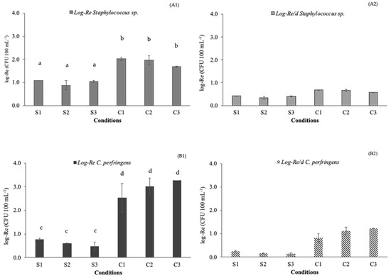 Removal efficiency in logarithmic units (log) and logarithmic units per day (log d−1) for C. perfringens ((A1,A2), respectively) and Staphylococcus sp. ((B1,B2), respectively) on average ± standard deviation. Values with the same letter (a, b, c, d) are statistically equal (α = 0.05). S1: Scenedesmus spp. inoculum; S2: Scenedesmus spp. inoculum + addition of CO2; S3: Scenedesmus spp. inoculum + addition of O2. C1: Chlorella vulgaris. inoculum; C2: Chlorella vulgaris. inoculum + addition of CO2; C3: Chlorella vulgaris. inoculum + addition of O2.