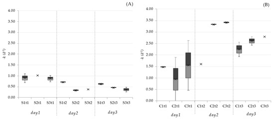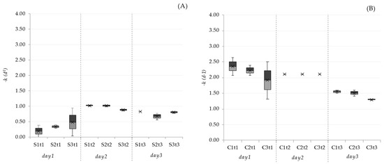 Daily inactivation rates of Staphylococcus sp. in Set I (A) and Set II (B). S1: Scenedesmus spp. inoculum; S2: Scenedesmus spp. inoculum + addition of CO2; S3: Scenedesmus spp. inoculum + addition of O2. C1: Chlorella vulgaris. inoculum; C2: Chlorella vulgaris. inoculum + addition of CO2; C3: Chlorella vulgaris. inoculum + addition of O2; t1, t2, and t3 indicate day 1, day 2, and day 3, respectively.