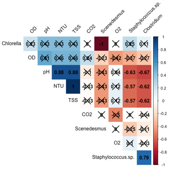 Spearman’s correlation coefficients obtained between inoculum (Scenedesmus acutus Meyen and Chlorella vulgaris), CO2 supplementation, aeration (O2), TSS concentration, NTU, pH, and DO. TSS: Total Suspended Solid; NTU: Nephelometric Turbidity Unit; DO: Dissolved Oxygen; pH: potential of hydrogen. Only the values without markings (X) are statistically significant (p > 0.05).