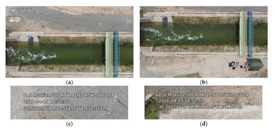 The final application goal of the method developed in this study is to measure a site where the ground control points cannot be installed because the width or size is too wide or too large. To that end, the developed method was applied to the upstream region of the Mujudaegyo Bridge, which is up to 140 m wide. The on-site situation and video recording using drones are shown in Figure 8. As Figure 8 shows, the river was too wide to allow for the capture of an adequate number of ground control points for both sides of the river into one frame.