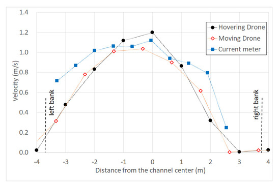 The results from the above method are shown in Figure 6. Although it is difficult to confirm visually, the flow velocity of the ground is calculated to be approximately 0, and the flow velocity distribution is appropriate along the cross section of the waterway. In addition, Figure 6 shows the results of processing the same video using the hovering drone method of converting all frames to reference frames using ground vertices and analyzing the images. However, in the hovering drone method, 90 frames (3 s video) from frame 180 to frame 269 were used because the images shared four points that can be used as ground control points.
