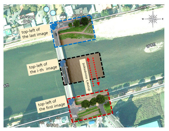 Finding the physical location using drone images requires some additional information. Existing research on surface velocity measurement using drones relies on ground landmarks; the existence of ground control points was essential for correcting the motion image, or for converting image displacement into physical displacement information. However, in large rivers, it is not possible to secure an appropriate number of surface landmarks. Therefore, in this study, a method to determine the physical location in drone images without the use of ground landmarks was devised.