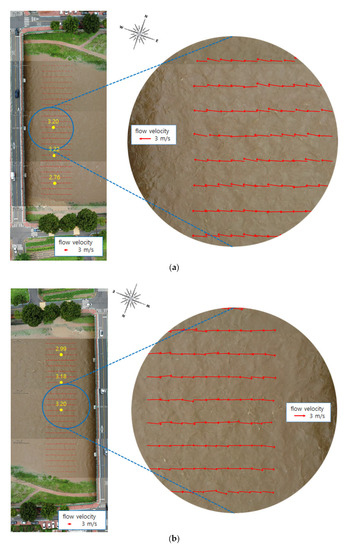 Velocity fields measured using the drone images. (a) Moving drone method; (b) Hovering drone method. (the numbers representing flow velocity were added later for reference).