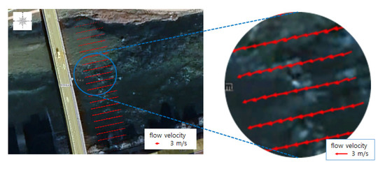 Furthermore, the outcome of directly displaying this result on Google Maps using QGIS is shown in Figure 10. Comparing Figure 10 with Figure 9a, it can be seen that the calculated flow velocity distribution is properly displayed on Google Maps.