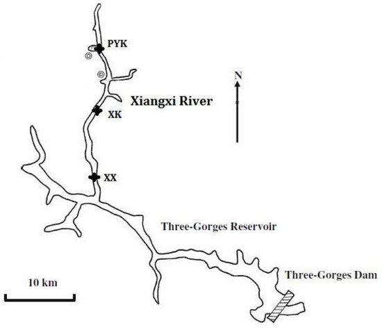 Sketch map of the sample stations in the Xiangxi River (three sample stations: XX, XK and PYK, located at the upstream, midstream and downstream).