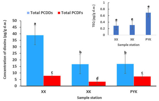 TOC, TIC, TC and the carbon-based concentrations of PCDD/F (Table 2) indicated significant spatio-temporal heterogeneity in organic carbon distribution (ANOVA, p < 0.05). The relationship between TOC and PCDD/F and the correlation between TOC and the PCDD/F/TOC value were significant (p < 0.01). Nie et al. [29] also found that the distribution of organic matter in the sediments decisively affected the partitioning of dioxins. Dioxins were usually partitioned predominantly in the organic matter of the sediment, while TOC played an important role in the distribution of dioxins.
