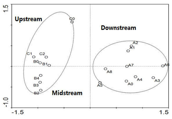 PCA analysis of the different samples from different depths in the sediment cores from the Xiangxi River. Samples A0~A8 were from the downstream, and samples B0~B4 and samples C0~C2 were from the midstream and upstream, respectively, which indicated a significant difference between the two groups at p < 0.05.