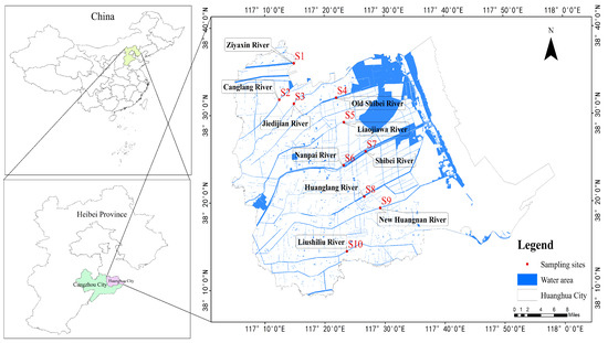 Huanghua City is located in the southeastern region of Hebei Province, China, between 38°09′ and 38°39′ north latitude and 117°05′ and 117°49′ east longitude. It is a total of 2391 km 2 . It serves as a water diversion area for the Yellow River, as well as a significant industrial and port city in the Beijing–Tianjin–Hebei region. In recent years, Huanghua City has seen an increase in the number of fisheries, battery industries, fertilizers, pesticides, and metal workshops. These massive wastewater discharges pose a threat to the ecosystems of inland rivers and the Bohai Sea. Water resource safety is inextricably linked to Huanghua City’s local economic and social development as the Yellow River receiving area. The location of the study area is shown in Figure 1.