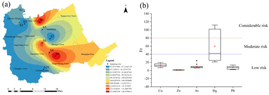 Figure 4a shows the spatial distributions of the general potential ecological risk index. The northern and southern parts of the city had higher RI values while posing little risk. Hg posed the highest risk. As shown in Figure 4b, the average Er of 10 sampling sites in descending order was Hg(59.500) > Cu(13.058) > As(10.210) > Pb(6.854) > Zn(1.202), among which Hg was a moderate risk, and other HMs were low risks.