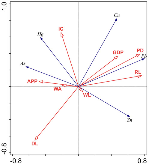 Cu and Pb are in the first category. RDA revealed a positive correlation between RL, Cu, and Pb. Previous studies had shown that coal combustion is the primary source of Cu and Pb pollution, and most of China’s energy supply comes from coal combustion, which is the identified element of motor vehicle pollution sources, influenced by industrialization and urbanization [26,27]. Pb was strongly positively correlated with PD, which indicated Pb pollution was more serious in places with high population density and heavy traffic, whereas Cu was strongly positively correlated with GDP, which indicated Cu pollution was also slightly influenced by industry. From Figure 8, it can be seen that traffic pollution has a more critical influence on factor 1 compared with industrial pollution in the central part of Huanghua City. In the future, the government should consider reducing the pollution caused by vehicle emissions by promoting low-carbon travel, building green belts, etc.