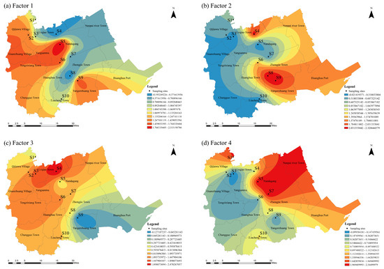 The fourth category is Zn. RDA revealed that WL and Zn had a significantly positive correlation, which indicated that Zn may be influenced by the natural geological background and soil parent materials of the river [31]. From Figure 8, it can be seen that factor 4 represented the natural origin in the northeastern part of Huanghua City.