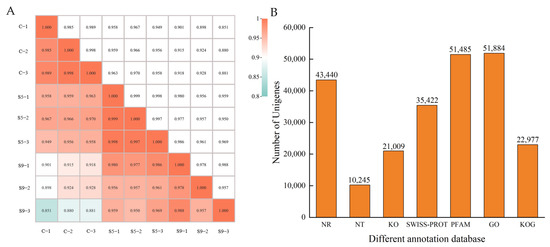 Pearson correlation coefficients for comparisons among all samples (A); number of unigenes functional annotation in different databases (B). (C: salinity 30 psu; S5: salinity 50 psu; S9: salinity 90 psu.)