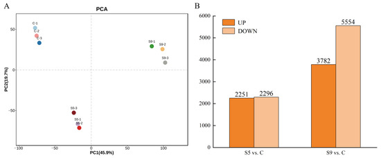 (A) Principal component analysis (PCA) of unigenes expression; (B) numbers of up- and downregulated DEGs in each comparison. (C: salinity 30 psu; S5: salinity 50 psu; S9: salinity 90 psu.)