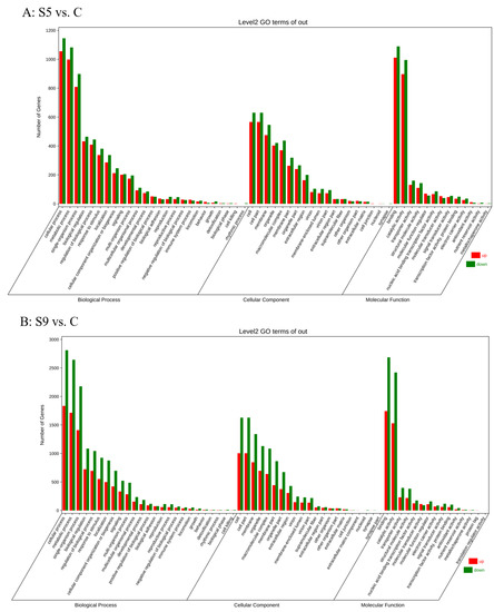 GO enrichment analysis of DEGs in S5 vs. C (A) and S9 vs. C (B). (C: salinity 30 psu; S5: salinity 50 psu; S9: salinity 90 psu.)