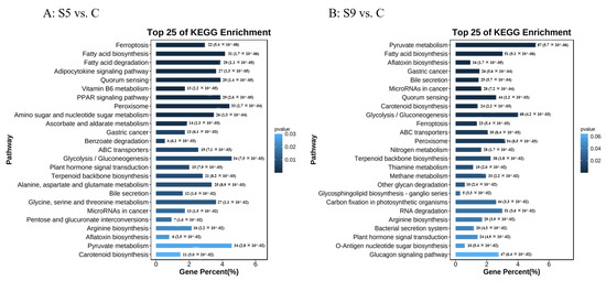 Top 25 pathways in the KEGG enrichment analysis of DEGs in S5 vs. C (A) and S9 vs. C (B). (C: salinity 30 psu; S5: salinity 50 psu; S9: salinity 90 psu.)
