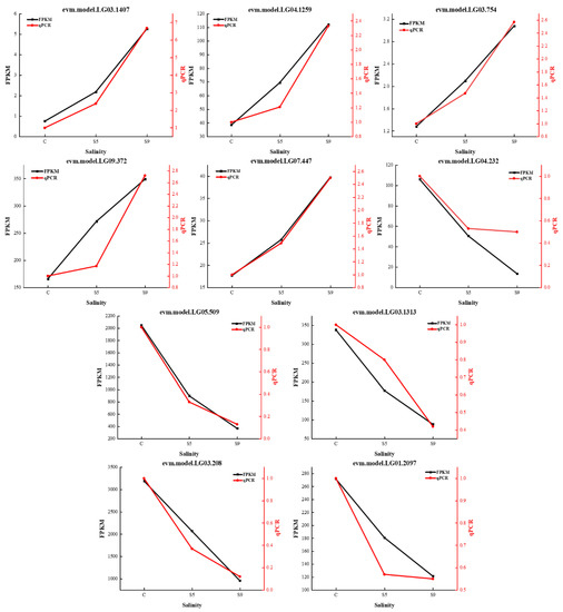 Five upregulated genes (evm.model.LG03.1407, evm.model.LG04.1259, evm.model.LG03.754, evm.model.LG09.372, and evm.model.LG07.447) and five downregulated genes (evm.model.LG04.232, evm.model.LG05.509, evm.model.LG03.1313, evm.model.LG01.2097, and evm.model.LG03.208) were randomly selected from the transcriptomic data and were validated by qRT-PCR. The results showed that the expression trends of the ten DEGs at different salinities (30, 50, and 90 psu) showed essentially the same changes as the relative expression levels of the DEGs detected by RNA-seq (Figure 5).
