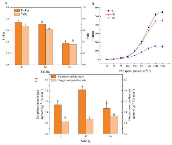 In addition, the photosynthetic oxygen release rate showed a trend of increasing and then decreasing with increasing salinity, and the photosynthetic oxygen release rate of group S5 was significantly higher than that of group C (p < 0.05), while the difference between group S9 and group C was not significant (p > 0.05). The respiratory oxygen consumption rate gradually increased with increasing salinity, but the difference among the three groups was not significant (p > 0.05) (Figure 7C).