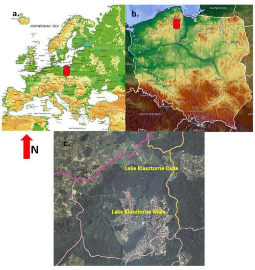 Klasztorne Małe and Klasztorne Duże lakes are located in Poland, approximately 30 km west of Gdańsk, within the administrative boundaries of the city of Kartuzy in the Kashubian Lake District (Figure 1). It is a physical and geographic mesoregion belonging to the East Pomeranian Lakeland macroregion [27]. According to the regionalization prepared by the Ministry of Environment, the Kashubian Lake District is entirely located in the Lower Vistula region.