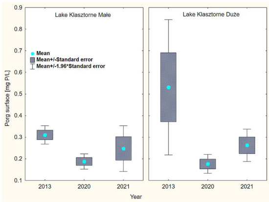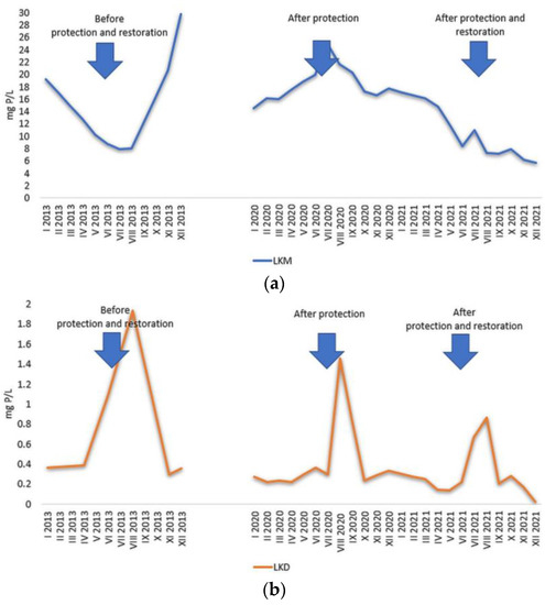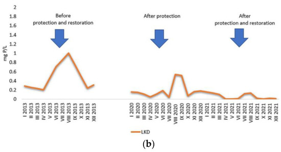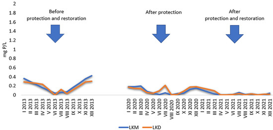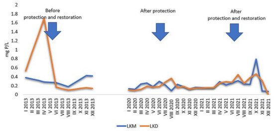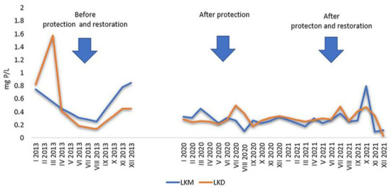 In the surface water layers of LKM, concentrations of organic phosphorus ranged from 0.077 mg P/L to 0.791 mg P/L, with both extreme values (minimum and maximum) recorded in the year of restoration—2021 (Figure 8). In the surface water layer of LKD, the concentrations of organic phosphorus ranged between 0.006 and 1.700 mg P/L (Figure 8). The maximum value was recorded in the period before the protection and restoration of the lake and the minimum in the year of restoration—2021.