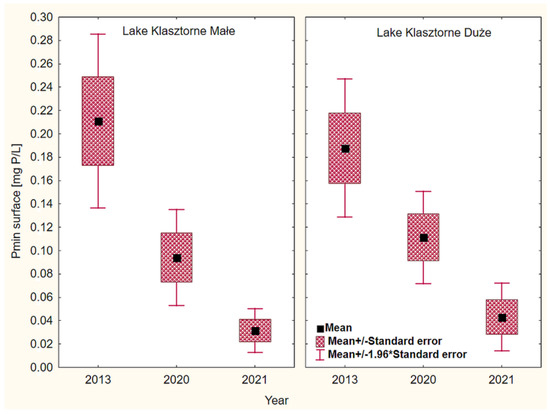 Average annual values of mineral phosphorus (Pmin.) in the surface water of Klasztorne lakes in selected research years.